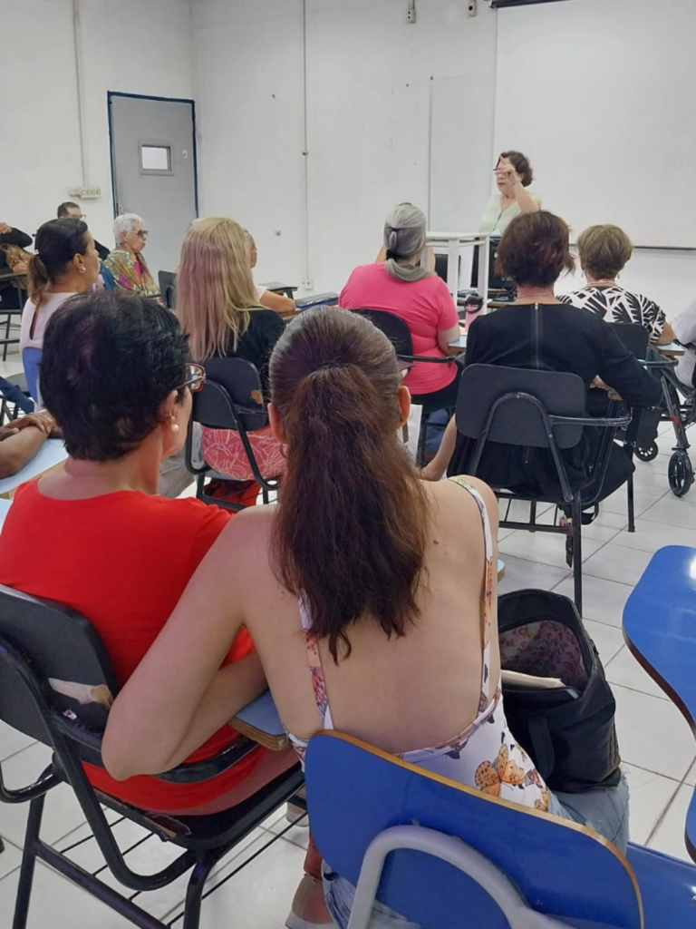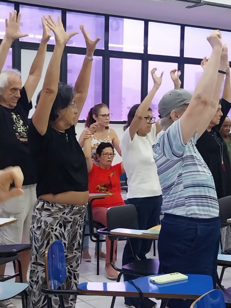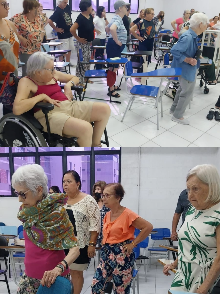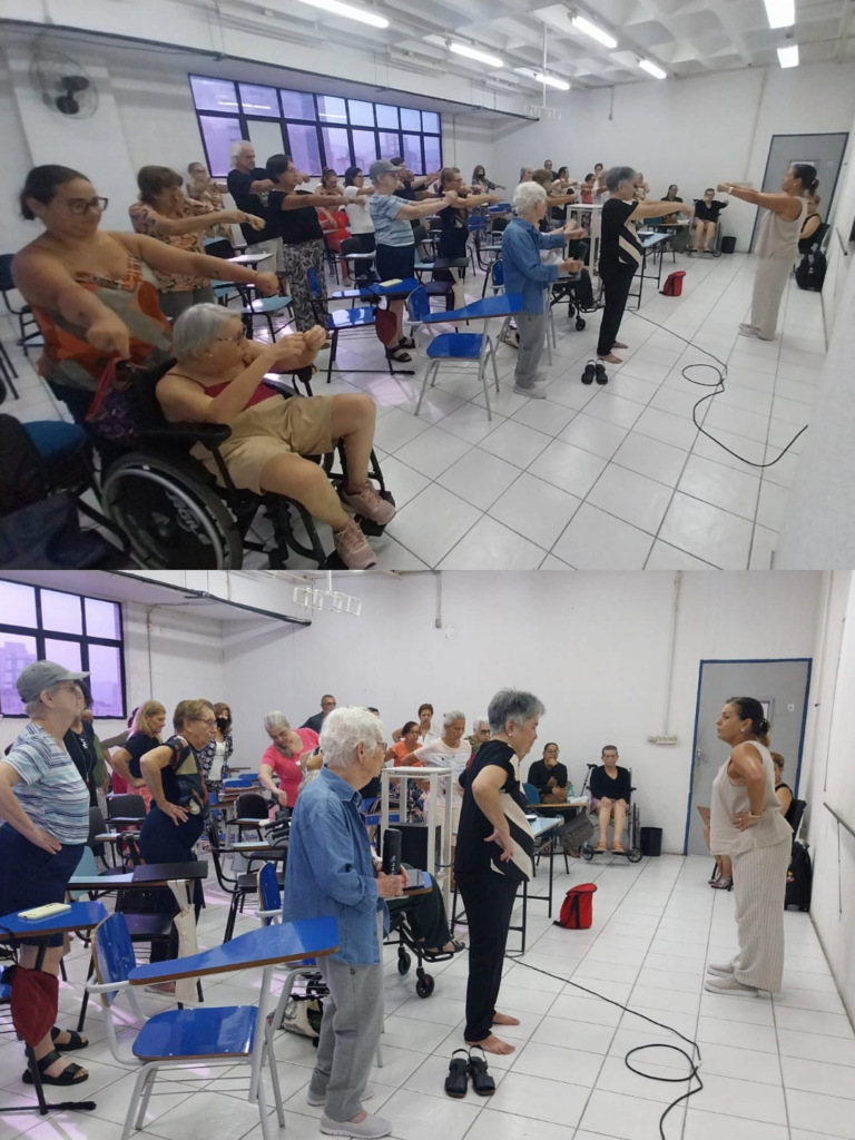 Além do alongamento e coreografia com a educadora física Maria Luiza Lens, também tivemos exercícios com a fonoaudióloga Cristina Jabbur.